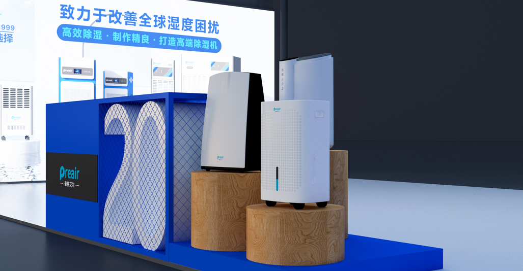 對(duì)于占比最大的兩塊燈箱海報(bào),將本次參展的全系列機(jī)型( 不包含外貿(mào)機(jī)型)靜態(tài)集中展示,配合品牌的主打廣告語和使命愿景,讓來展臺(tái)的觀眾,一下就能關(guān)注到我司的使命:普林艾爾——致力于改善全球濕度困擾。
